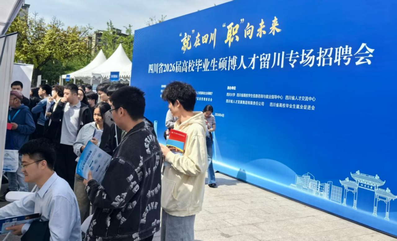 4月29日,“就在四川・职向未来”四川省2026届高校毕业生硕博人才留川专场招聘会在四川大学望江校区举办。本次招聘会汇聚省内400余家优质用人单位线上线下同步纳才,累计提供优质岗位7000余个,吸引全省各高校近万名硕博毕业生现场求职。